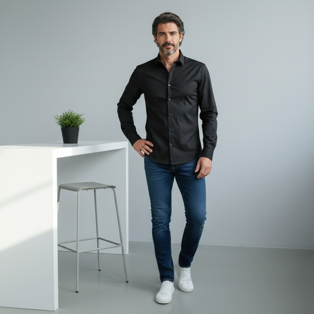 Čierna elastická bambusová pánska košeľa pre všetkých mužov, ktorí preferujú tmavé odtiene , jednoduchosť a pohodlnosť. Bambusové vlákno je priedušné a v lete chladivé. Elastan v košeli zaistí vyformovanie postavy. Minimalistický kúsok vhodný na každodenné nosenie aj na rôzne spoločenské príležitosti či už formálneho alebo neformálneho charakteru. Dostupná v strihu Slim. Zloženie košele: 51% bambus, 44 % polyester a 5 % elastan .
